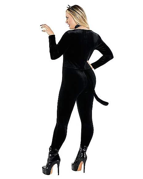 MEOW! This all-black catsuit will turn you into a fierce feline in no time at all! The velour jumpsuit comes complete with an attached tail for the ultimate look. Add the included cat ear headband and get ready to take on Halloween night!