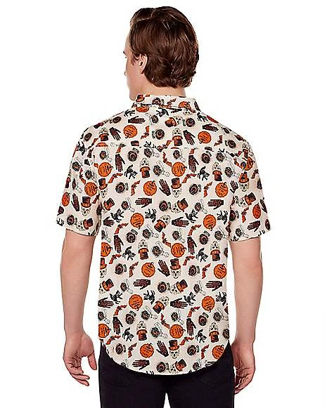 Embrace your spooky side when you rock this Vintage Button Up Shirt! Featuring images of skulls, black cats, magic potions, and bats, this throwback top will definitely boost your style.