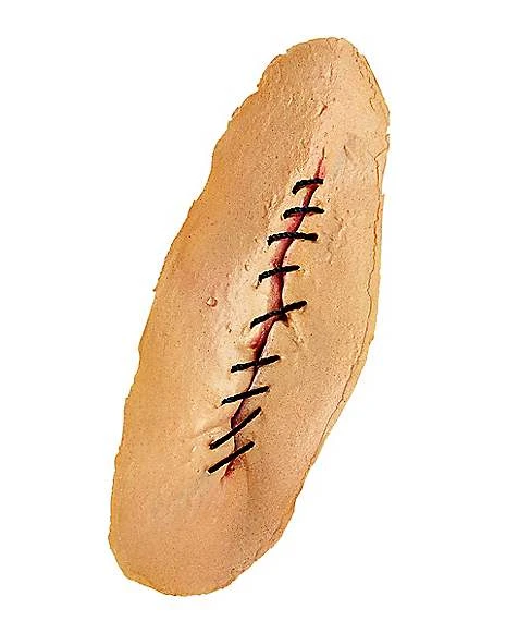 These fake, yet gruesome loose stitches give the impression that you ran out of the emergency room a bit prematurely. This highly realistic, pre-painted facial prosthetic goes on in three easy steps. Perfect whether you are an emergency room patient, a shark attack victim or a psycho killer!